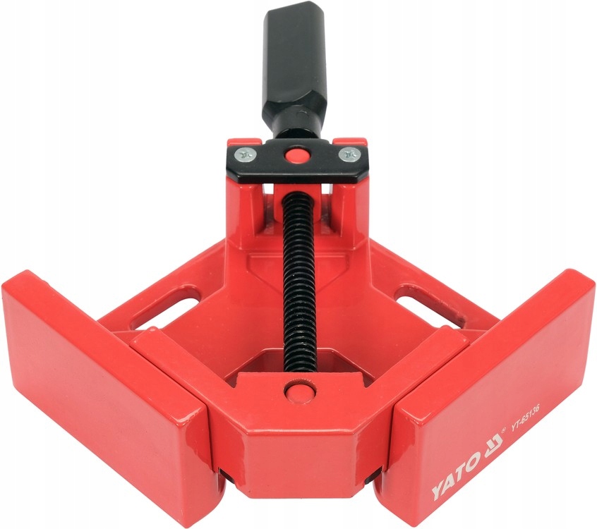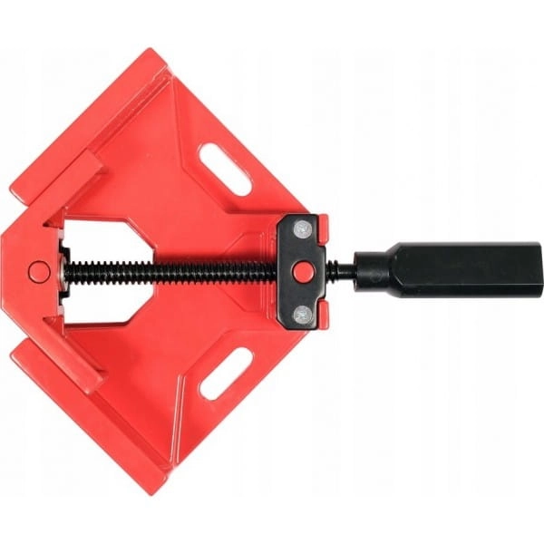 Imadło kątowe do mocowania elementów pod kątem 90°. Korpus wykonany z aluminium podstawa 150 x 150 mm głębokość / grubość max. mocowanych elementów ok. 70 mm, wysokość zew. ścian ok 55 mm grubość ścian ok 13 mm w podstawie otwory do mocowania 10 mm x 32 mm. Śruba metalowa toczona fi 12mm umocowana w przegubie daje możliwość zmiany kąta mocowania poprzez docisk do jednej ściany, pokrętło plastikowe.