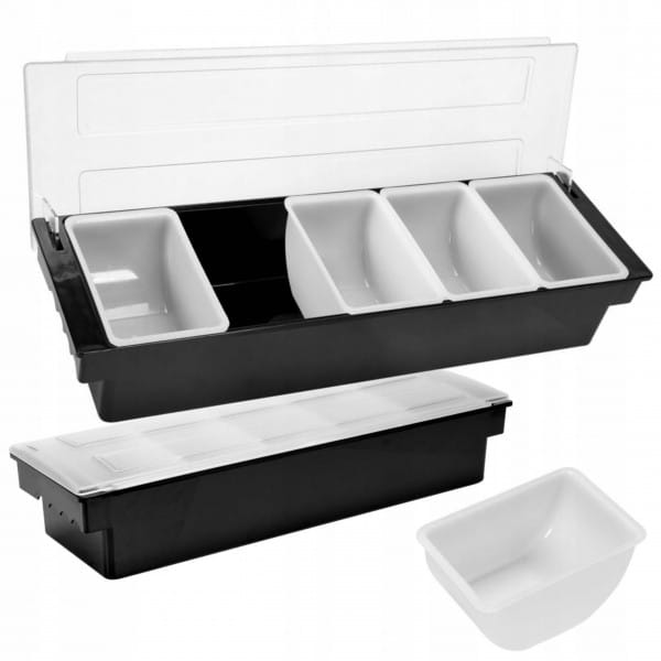 Wykonany z wysokiej jakości, wytrzymałego ABS o wymiarach 500x160x100mm z transparentną pokrywką z odpornego na uszkodzenia poliwęglanu.Przeznaczony jest do serwowania dodatków do napojów i drinków: