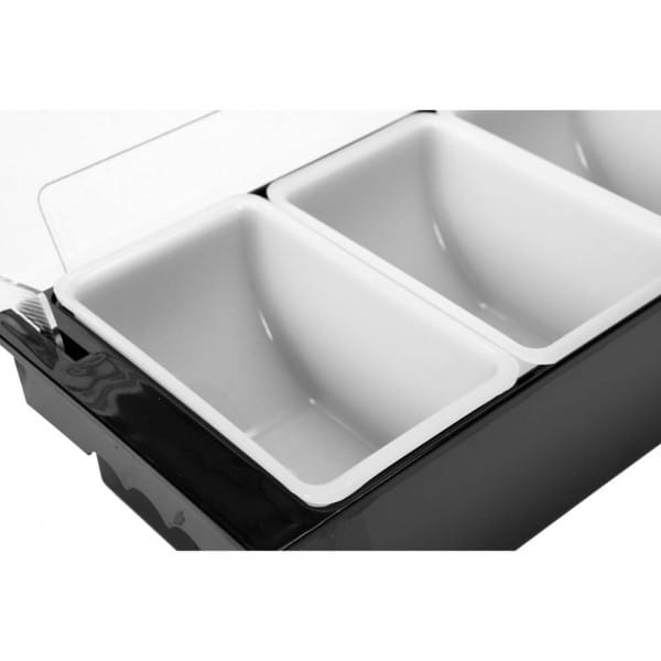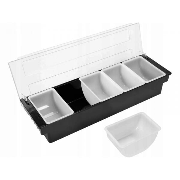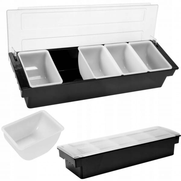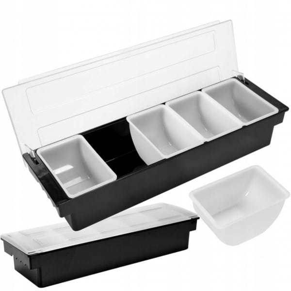 Wykonany z wysokiej jakości, wytrzymałego ABS o wymiarach 500x160x100mm z transparentną pokrywką z odpornego na uszkodzenia poliwęglanu.Przeznaczony jest do serwowania dodatków do napojów i drinków: