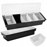 Posiada 5 wyciąganych pojemników z polipropylenu, każdy o pojemności 650ml i wymiarach 100x45mm.Pojemnik jest bardzo praktyczny i funkcjonalny i doskonale sprawdza się w barach i restauracjach.