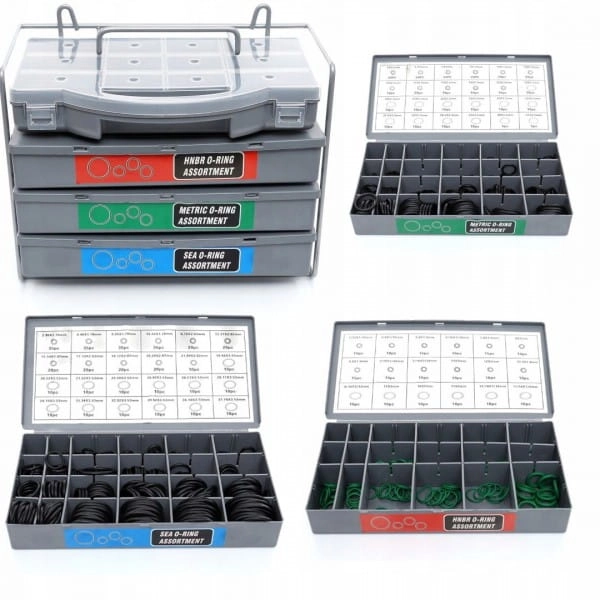 Całość zapakowana jest w plastikowym pojemniku, w którym każdy rozmiar uszczelki ma swoje oznaczone miejsce.