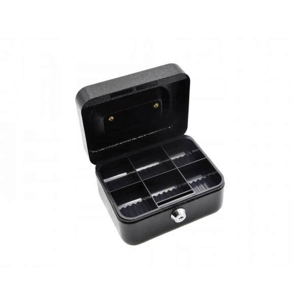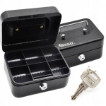 Metalowa kasetka na pieniądze. Zamykana na kluczyk (2 szt. w zestawie). Wyposażona w uchwyt do przenoszenia. W środku plastikowa wkładka z przegródkami: