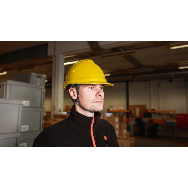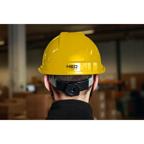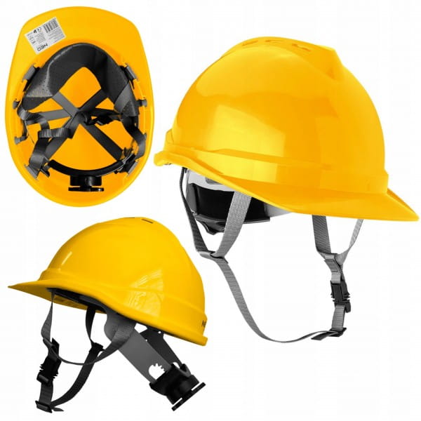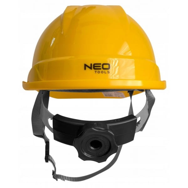 Hełm przemysłowy z paskiem podbródkowym, żółty 97-220 NEO to niezbędne zabezpieczenie głowy, przeznaczone szczególnie do prac na wysokościach, w magazynie, podczas wykopów czy na rusztowaniu.
