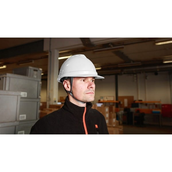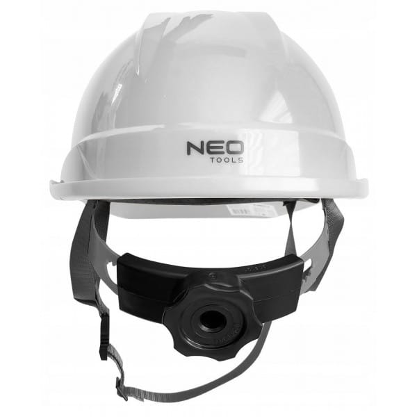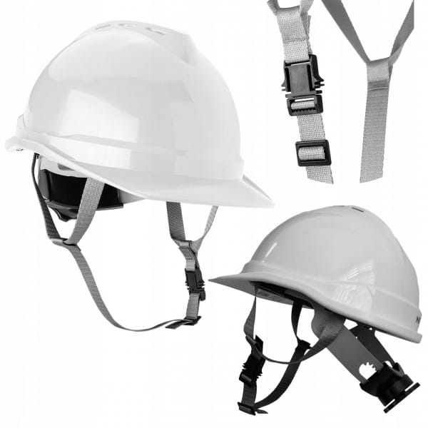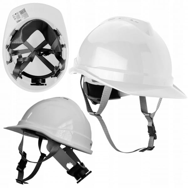 Hełm przemysłowy z paskiem podbródkowym, biały 97-221 NEO to niezbędne zabezpieczenie głowy, przeznaczone szczególnie do prac na wysokościach, w magazynie, podczas wykopów czy na rusztowaniu.
