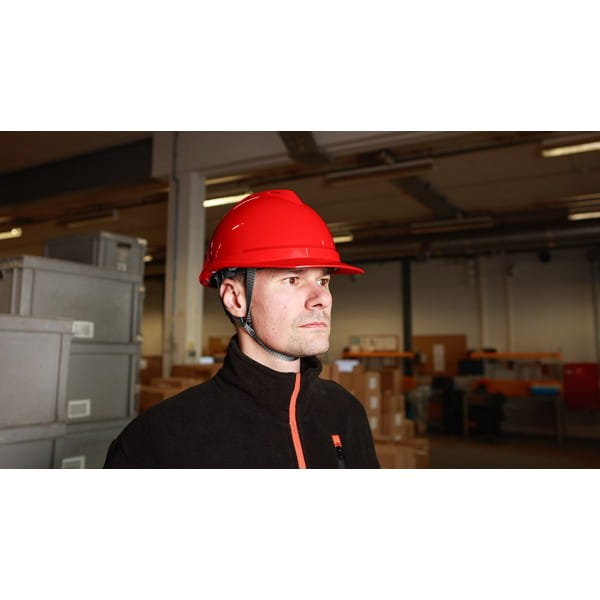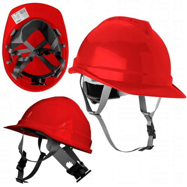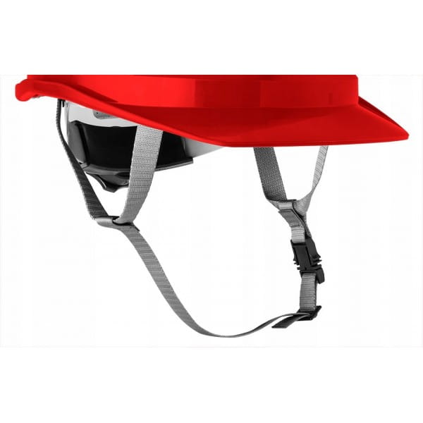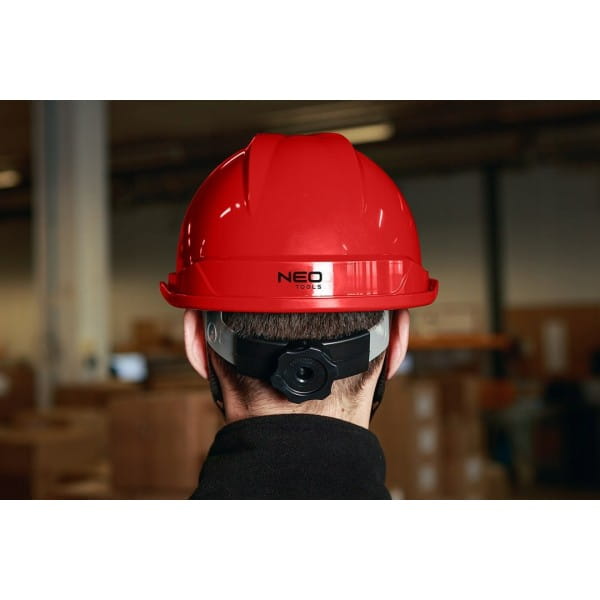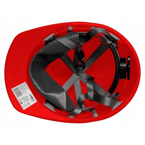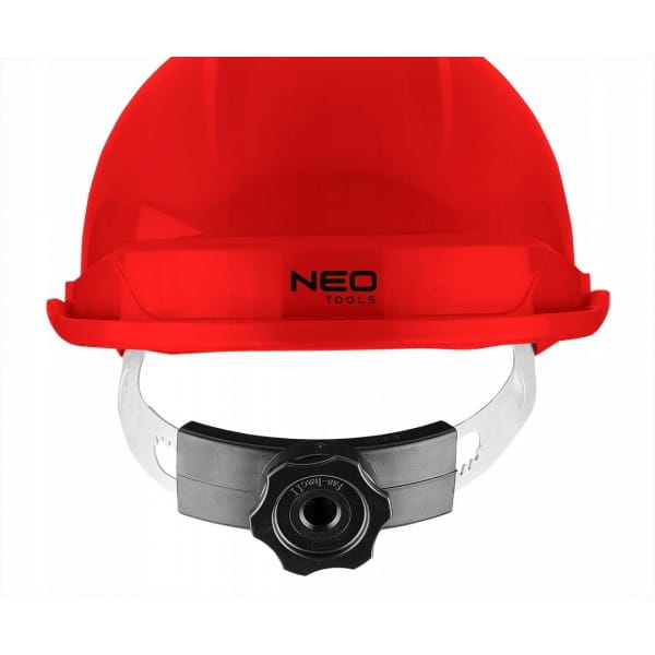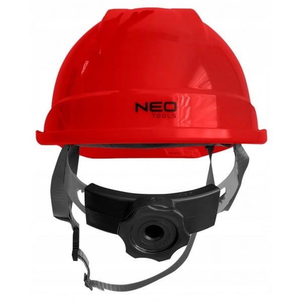 Hełm przemysłowy z paskiem podbródkowym, czerwony 97-224 NEO to niezbędne zabezpieczenie głowy, przeznaczone szczególnie do prac w magazynie, podczas wykopów czy na rusztowaniu.