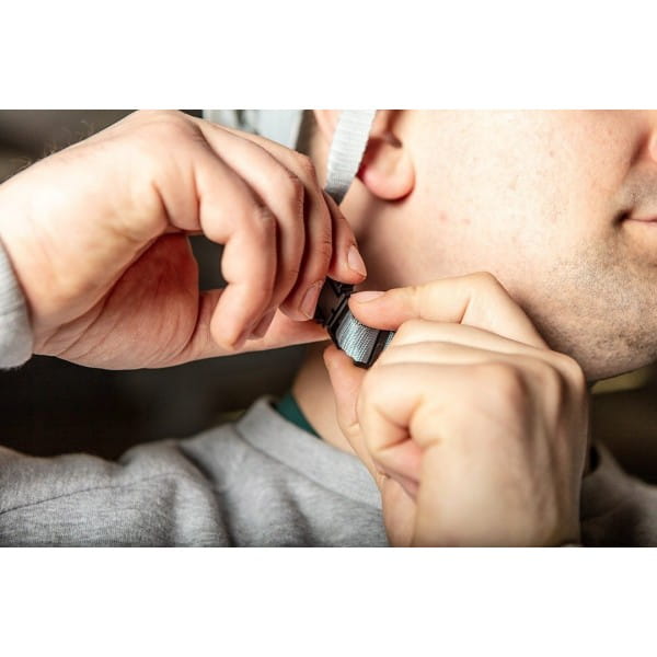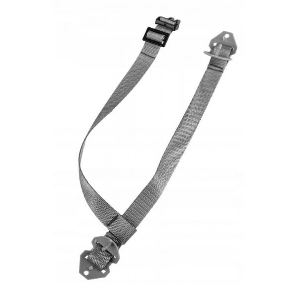 Pasek podbródkowy do hełmu, materiał : poliester, 4-punktowy, pasuje do większości hełmów na rynku, zapinany na plastikową klamrę, regulacja długości paska