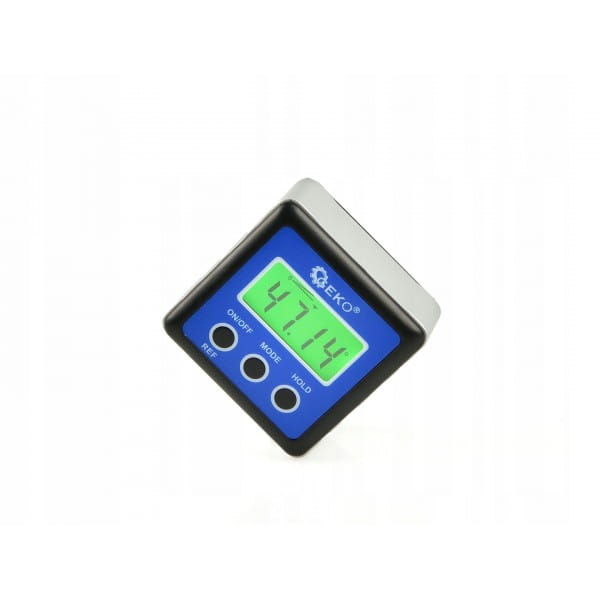 Kątomierz elektroniczny przeznaczony do szybkiego i dokładnego pomiaru kąta między dwiema płaszczyznami. Szczególnie przydatny podczas ustawiania maszyn, np. kąta nachylenia tarczy w przecinarkach stołowych. Urządzenie posiada duży czytelny podświetlany wyświetlacz. Funkcja HOLD pozwala zachować aktualny pomiar na wyświetlaczu. Funkcja REF daje możliwość wyzerowania kątomierza w dowolnej pozycji i wykonania pomiaru referencyjnego. Miernik wyposażony został w magnes umieszczony w podstawie co znacznie ułatwia wykonywanie pomiarów na stalowych elementach.