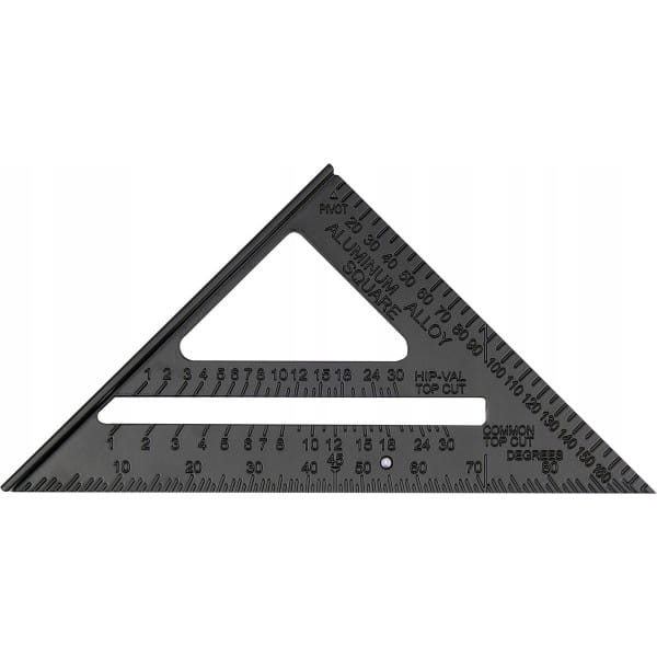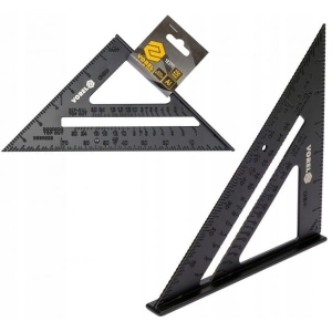 Na krawędziach zaznaczone trwale podziałki milimetrowe i calowe z przeznaczeniem do pomiarów ciesielskich i dekarskich. Powierzchnia kątownika lakierowana.