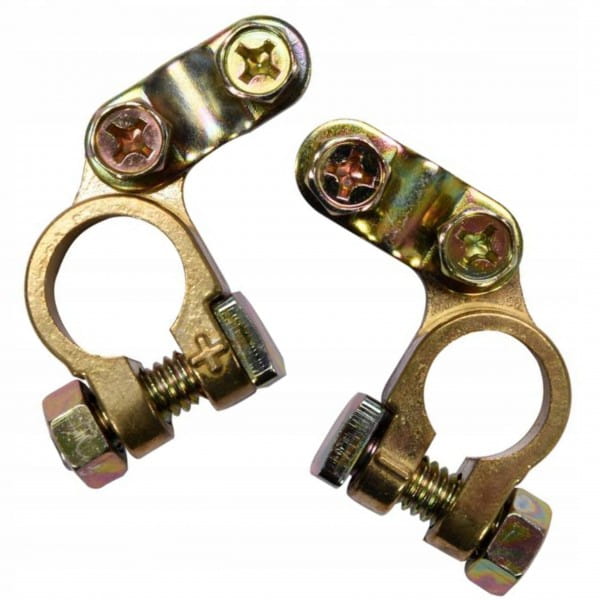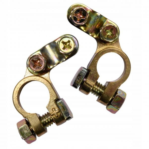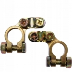 Komplet 2 sztuk solidnych klem do akumulatora wykonanych ze stopu mosiądzu. Przeznaczony do samochodów osobowych i motocykli. W zestawie klema dodatnia i ujemna.