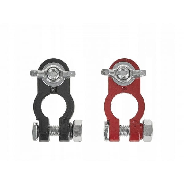 Zadbaj o bezproblemowe połączenie akumulatora w swoim pojeździe dzięki wysokiej jakości klemom zaciskowym. To niezawodny zestaw składający się z dwóch klem: czerwonej oznaczającej biegun dodatni (+) oraz czarnej dla bieguna ujemnego (-). Idealny wybór zarówno dla akumulatorów 6V, jak i 12V.