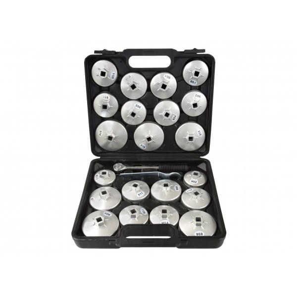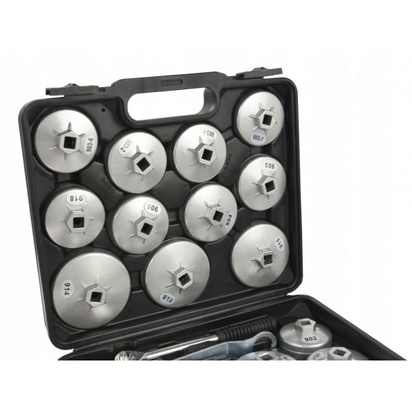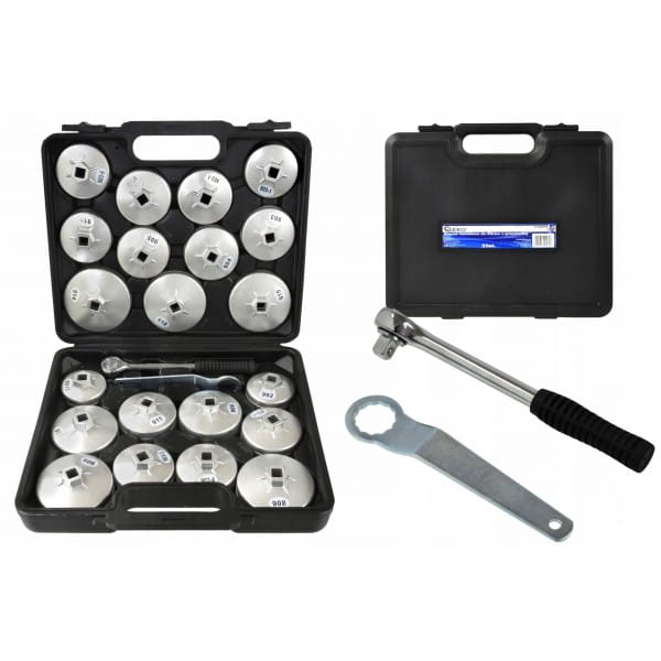 Zestaw 21 nasadek do odkręcania filtrów oleju. Pasuje do większości samochodów osobowych produkowanych na rynku europejskim, amerykańskim oraz azjatyckim.