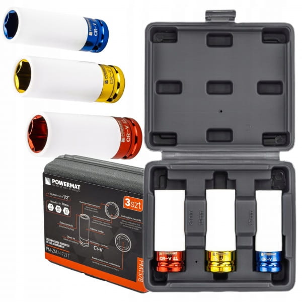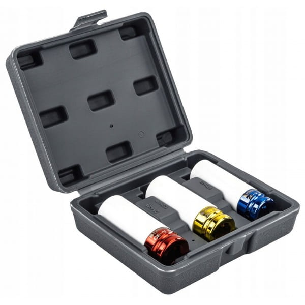 Zestaw obejmuje 3 nasadki w rozmiarach 17 mm, 19 mm i 21 mm, dzięki czemu pasuje do najczęściej spotykanych śrub w felgach aluminiowych.