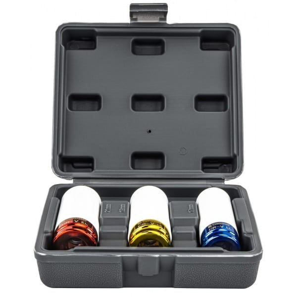 Zestaw zawiera 3 rozmiary: 17 mm, 19 mm i 21 mm, zapewniając pełne dopasowanie do najczęściej spotykanych śrub w felgach aluminiowych.