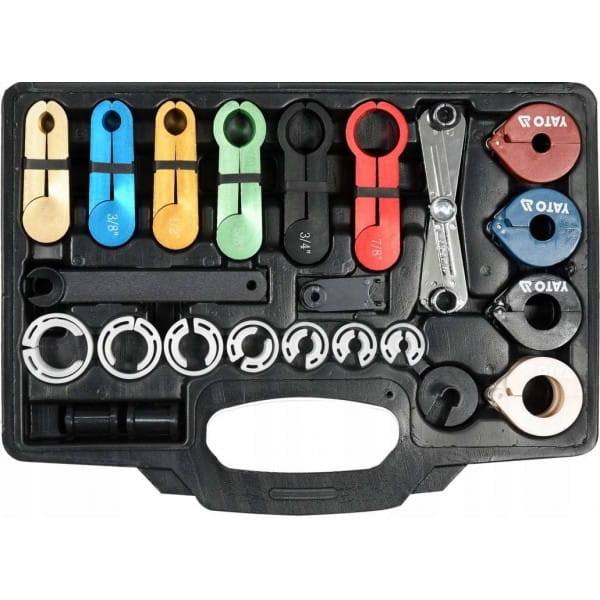 Profesjonalny zestaw do rozpinania, otwierania złączek systemów paliwowych i klimatyzacji. Zaciskają przewody i trwale blokują wycieki. Zaciski znakomicie nadają się do różnego rodzaju przewodów gumowych i z tworzywa. Klipsy pasują do większości marek samochodów osobowych pozwalające np. na szybkie zablokowanie przepływu freonu w przewodach klimatyzacyjnych. Uniwersalny zestaw przydatny w każdym zakładzie i warsztacie.