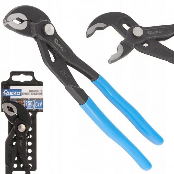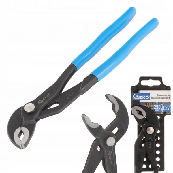 Szczypce do rur nastawne z przyciskiem 250mm Geko G00843 to profesjonalne narzędzie stosowane do pracy z rurami o różnych rozmiarach. Wykonane są z wysokogatunkowej stali chromowo-wanadowej (CrV), co zapewnia im trwałość i wytrzymałość na działanie sił mechanicznych.