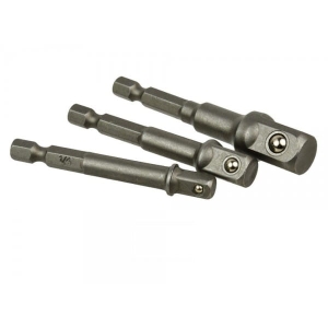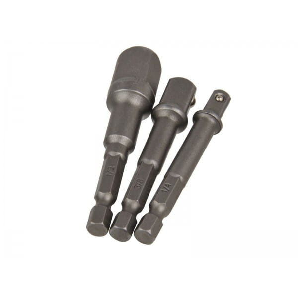 Zestaw adapterów / redukcji do nasadek wkrętarki. Redukcje wykonane zostały z wytrzymałej stali chromowo-wanadowej (CrV). Zestaw adapterów umożliwia stosowanie przy wkrętarce nasadek na 1/2”, 3/8” oraz 1/4”.