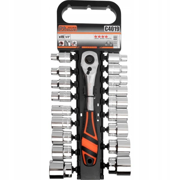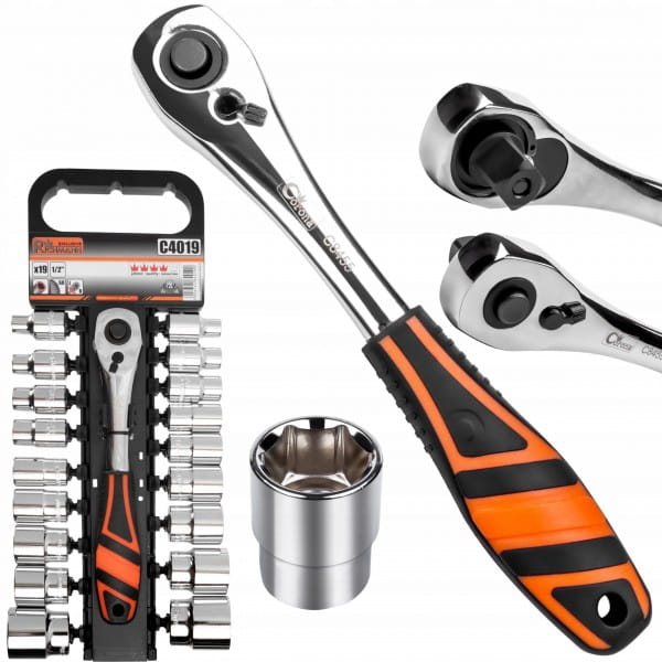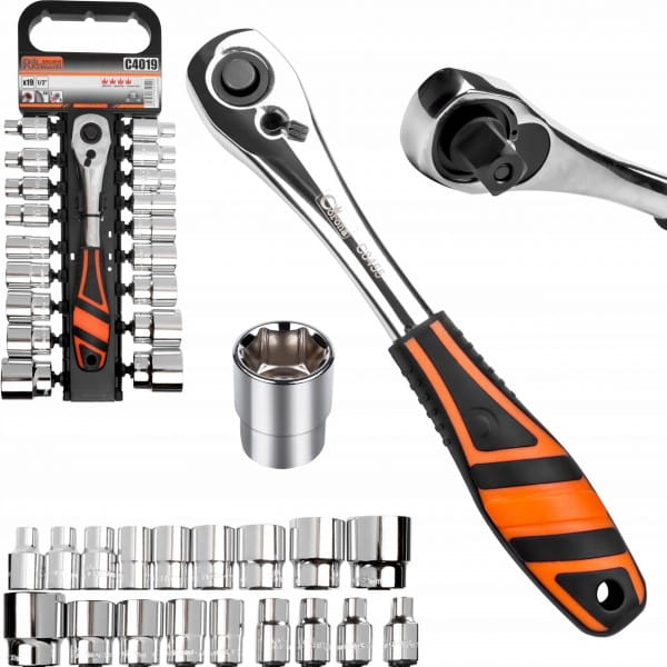 Zestaw 19 sztuk nasadek z grzechotką 1/2”.
