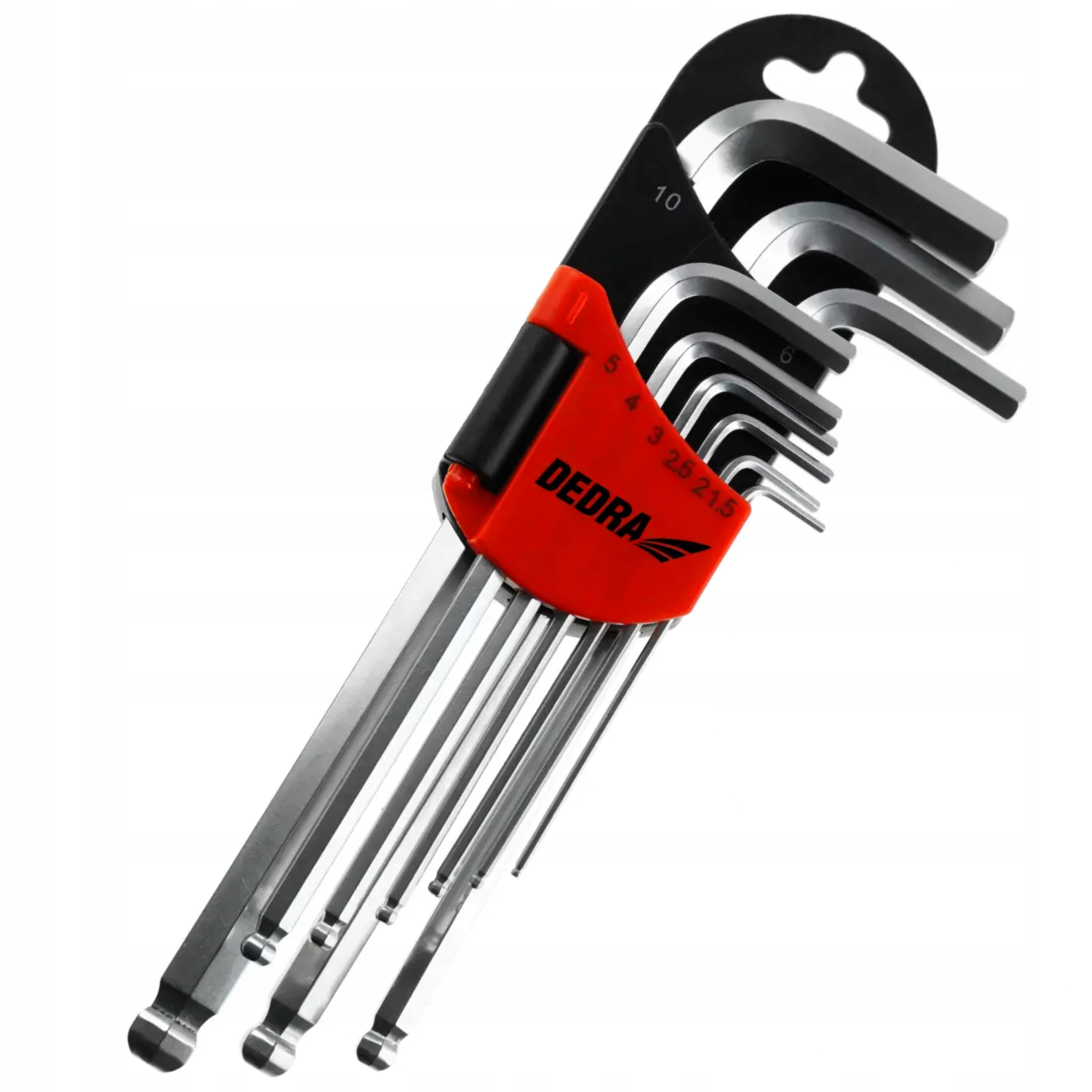 Zestaw 9 kluczy sześciokątnych długich o końcówce roboczej HEX z kulką, zwanych imbusami. Dzięki zakończeniu klucza kulką możliwa jest praca w trudno-dostępnych miejscach. Klucze wykonane zostały ze stali chromowowanadowej, cechującej się dużą wytrzymałością i odpornością na korozje. Klucze zamocowane zostały do wygodnego i trwałego uchwytu, zapewniającego nam szybki dostęp do kluczy.