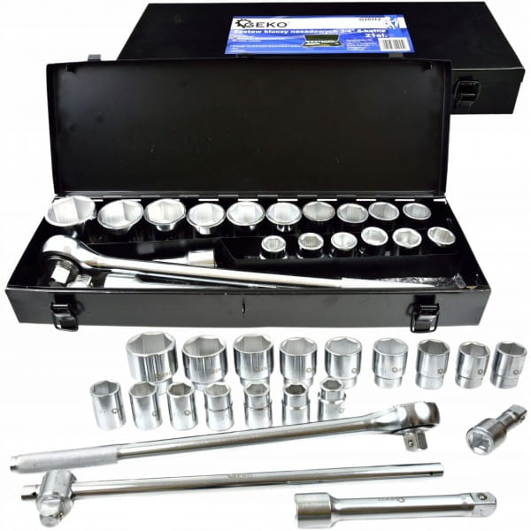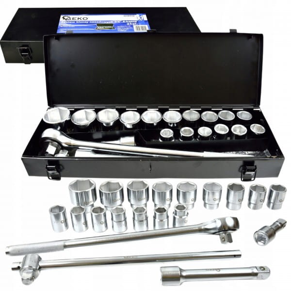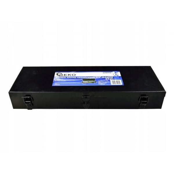 Zestaw kluczy nasadowych marki GEKO składający sie z 21 elementów. Zestaw zawiera pakiet nasadek 6-kątnych z gniazdem 3/4", pokrętło typu T (3/4"), grzechotkę (3/4") oraz zestaw przedłużek (3/4"). Wszystkie elementy zestawu wykonane są z wysokiej jakości stali chromowo-wanadowej CrV. Całość umieszczona jest w metalowej walizce.