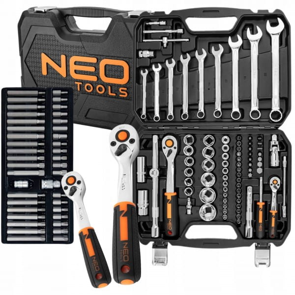 Klucze nasadowe ½”, ¼”, zestaw 82 sztuk, CRV, 10-059 NEO to wysokiej jakości komplet aż 82 sztuk produktów, oferowanych w wygodnej walizce z tworzywa sztucznego z metalowymi zatrzaskami oraz poręcznym uchwytem. Umieszczenie w niej wertykalnie elementów gwarantuje większą wygodę korzystania oraz szybsze skompletowanie wymaganych przyborów. Zestaw składa się łącznie na następujące narzędzia oraz akcesoria: