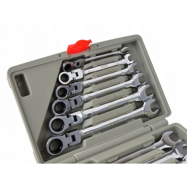 Zestaw kluczy łamanych płasko-oczkowych z grzechotką (72 zęby) 8-19mm wykonanych z wytrzymałej stali chromowo-wanadowej (CrV). Znajdą zastosowanie w profesjonalnych warsztatach samochodowych, jak również w przydomowym garażu. Klucze umieszczone są w poręcznej walizce z tworzywa sztucznego.