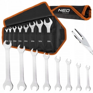 Klucze płaskie dwustronne, super cienkie NEO (nr ref. 09-860) te zestaw 8 sztuk kluczy płaskich dwustronnych o grubości 3 mm i rozmiarach: 5.5 x 7 mm, 8 x 9 mm, 10 x 12 mm, 11 x 13 mm, 14 x 17 mm, 19 x 21 mm, 22 x 23 mm, 24 x 27 mm. Całość zapakowana w materiałowe etui.