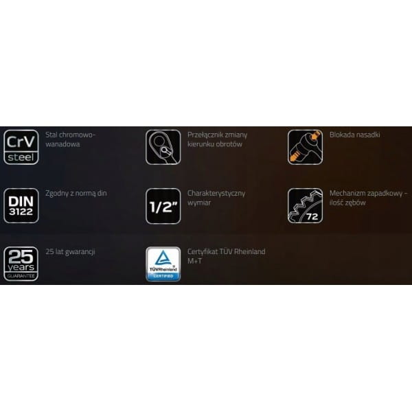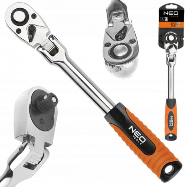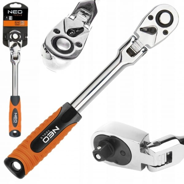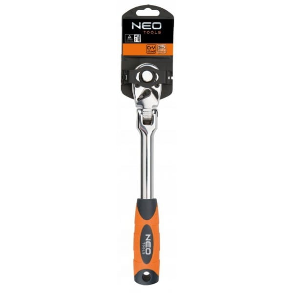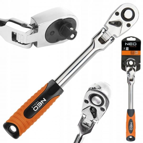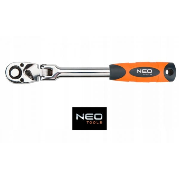 Grzechotka 1/2" NEO o długości 285 mm, z korpusem ze stali chromowo-wanadowej, wykonana zgodnie z normą DIN 3122. Odginana głowica o zakresie ruchu 180° umożliwia pracę w specjalnych warunkach. 72 zębowy mechanizm zapadkowy umożliwia precyzyjną pracę, wykonany jest z wyjątkowo trwałej stali chromowo-molibdenowej przedłużającej żywotność narzędzia. Ergonomiczny, dwumateriałowy uchwyt poprawia komfort pracy. Jakość narzędzia potwierdzona certyfikatem TÜV i .