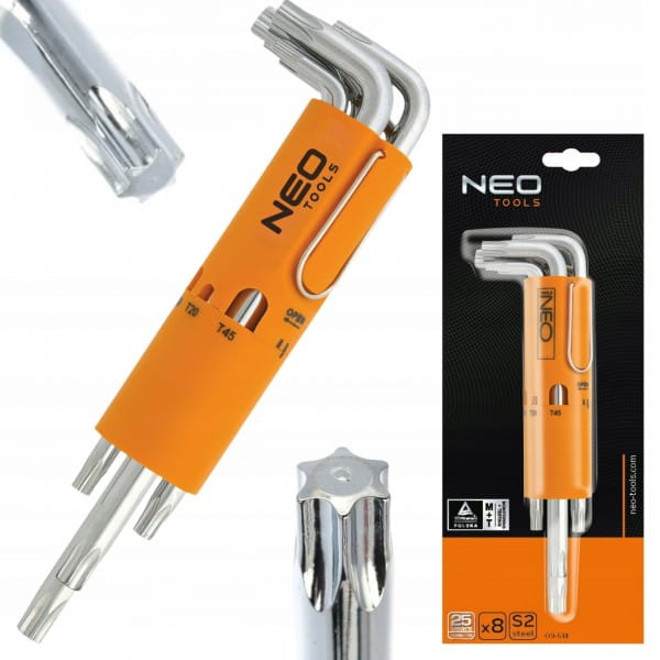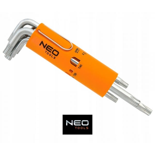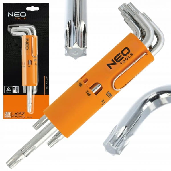 Zestaw kluczy Torx NEO zawiera 8 kluczy w rozmiarze od T10 do T50. Wysokogatunkowa stal stopowa S2 zapewnia długoletnią wytrzymałość. Całość umieszczona w praktycznym opakowaniu. Jakość narzędzia potwierdzona certyfikatem TÜV i .