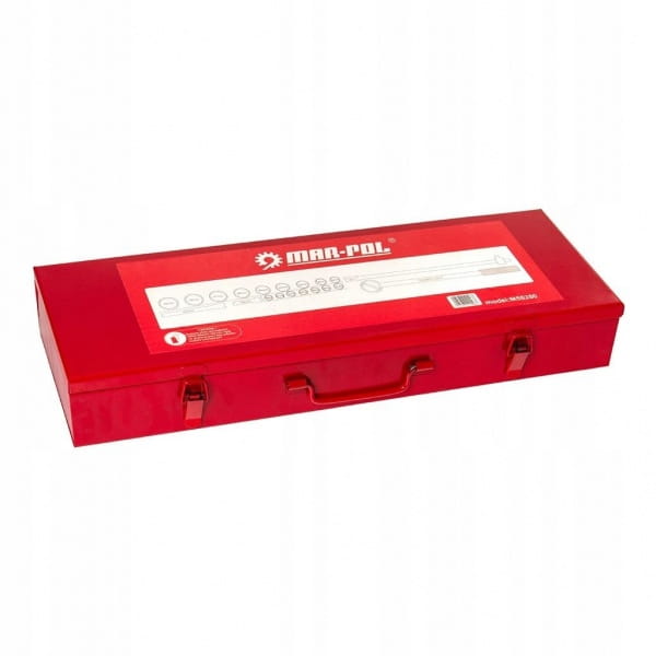 Zestaw 21-elementowy kluczy nasadowych z napędem 3/4". W jego skład wchodzą nasadki, grzechotka, pokrętło typu T oraz zestaw przedłużek- wszystkie kompatybilne z gniazdem 3/4". Narzędzia wykonano z trwałej stali, co zapewnia ich niezawodność i odporność na uszkodzenia. Komplet zapakowany jest w solidną, metalową walizkę, ułatwiającą transport i przechowywanie.