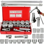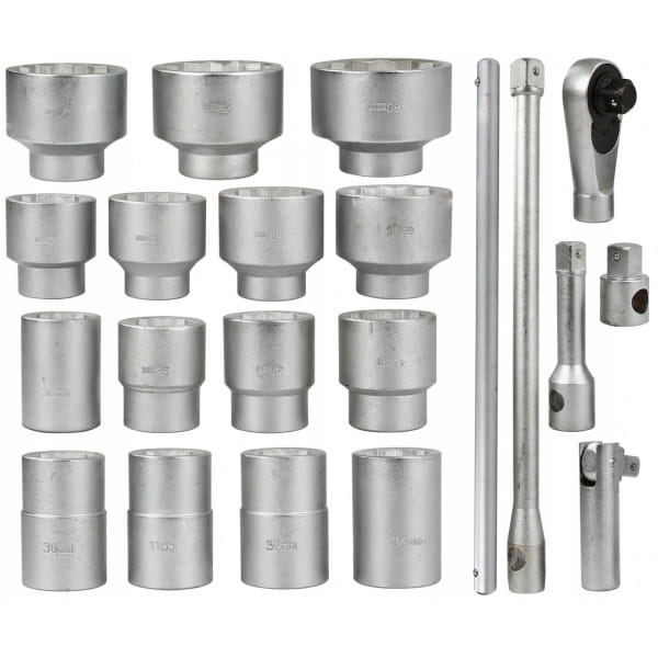 W zestawie znajdują się klucze nasadowe wraz z grzechotką i przedłużkami, wykonane z bardzo trwałego i solidnego materiału. Nasadki oraz końcówki przedłużek na 1".