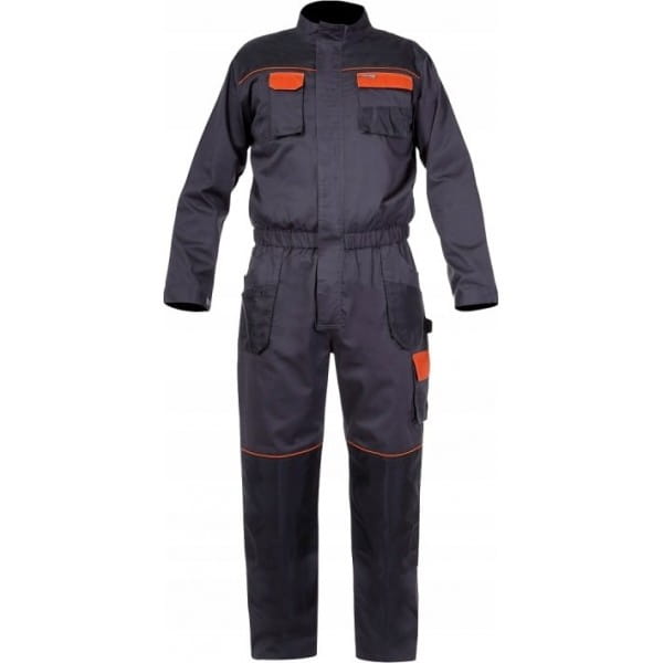Kombinezon roboczy wykonany z 35% bawełny oraz 65% poliestru. Posiada 11 kieszeni w tym siedem zapinanych na rzep. Dwustronny zamek błyskawiczny oraz otwory wentylacyjne zwiększające cyrkulację powietrza wewnątrz kombinezonu. Mocne potrójne szwy. Rękawy z regulacją na rzep i regulacja szerokości w pasie za pomocą gumki. Dodatkowe oczko na klucze oraz szlufka na młotek. Wzmocnione rękawy, karczek oraz kieszenie na ochraniacze kolan materiałem 300D (poliester) odpornym na przetarcia. Wszywka identyfikacyjna. Do kombinezonu dodatkowo można zakupić ochraniacze kolan o numerze katalogowym LPN001. Odzież robocza posiada certyfikat CE oraz normę EN ISO 13688 oraz jest w pierwszej kategorii środków ochrony indywidualnej.