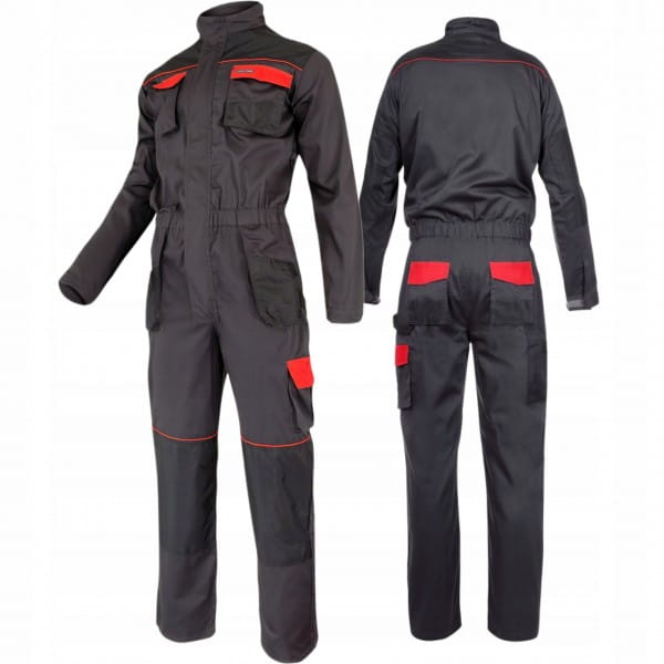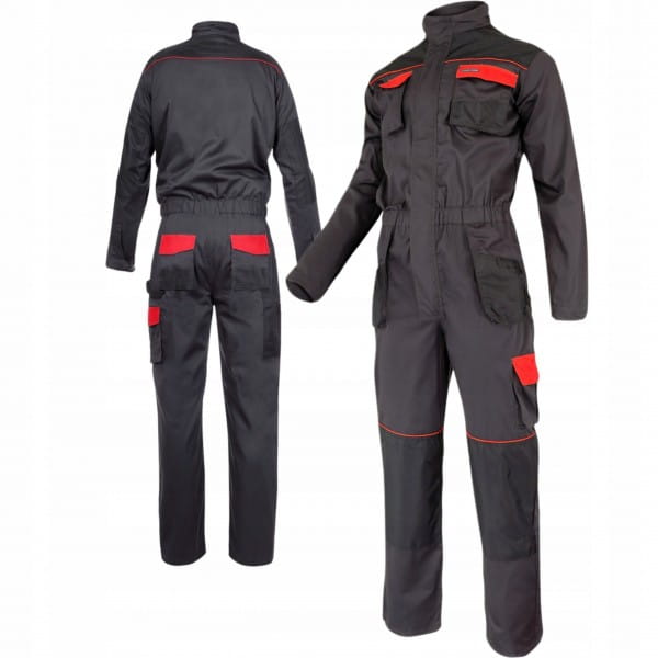 Kombinezon roboczy wykonany z 35% bawełny oraz 65% poliestru. Posiada 11 kieszeni w tym siedem zapinanych na rzep. Dwustronny zamek błyskawiczny oraz otwory wentylacyjne zwiększające cyrkulację powietrza wewnątrz kombinezonu. Mocne potrójne szwy. Rękawy z regulacją na rzep i regulacja szerokości w pasie za pomocą gumki. Dodatkowe oczko na klucze oraz szlufka na młotek. Wzmocnione rękawy, karczek oraz kieszenie na ochraniacze kolan materiałem 300D (poliester) odpornym na przetarcia. Wszywka identyfikacyjna. Do kombinezonu dodatkowo można zakupić ochraniacze kolan o numerze katalogowym LPN001. Odzież robocza posiada certyfikat CE oraz normę EN ISO 13688 oraz jest w pierwszej kategorii środków ochrony indywidualnej.