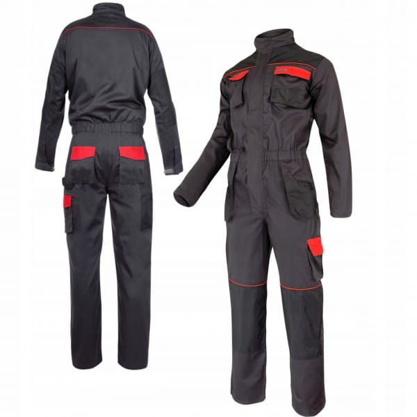 Kombinezon roboczy wykonany z 35% bawełny oraz 65% poliestru. Posiada 11 kieszeni w tym siedem zapinanych na rzep. Dwustronny zamek błyskawiczny oraz otwory wentylacyjne zwiększające cyrkulację powietrza wewnątrz kombinezonu. Mocne potrójne szwy. Rękawy z regulacją na rzep i regulacja szerokości w pasie za pomocą gumki. Dodatkowe oczko na klucze oraz szlufka na młotek. Wzmocnione rękawy, karczek oraz kieszenie na ochraniacze kolan materiałem 300D (poliester) odpornym na przetarcia. Wszywka identyfikacyjna. Do kombinezonu dodatkowo można zakupić ochraniacze kolan o numerze katalogowym LPN001. Odzież robocza posiada certyfikat CE oraz normę EN ISO 13688 oraz jest w pierwszej kategorii środków ochrony indywidualnej.