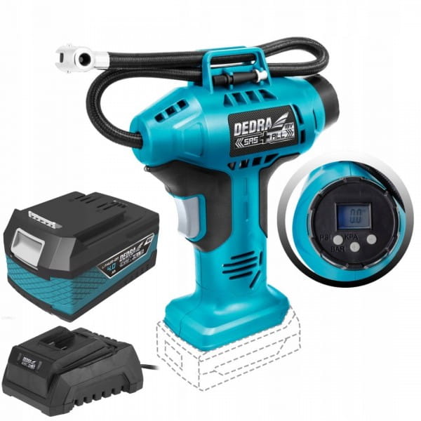 Kompresorek, pompka pistoletowa akumulatorowa 18V DEDRA SAS+ALL 11Bar, z wyświeltaczem LCD