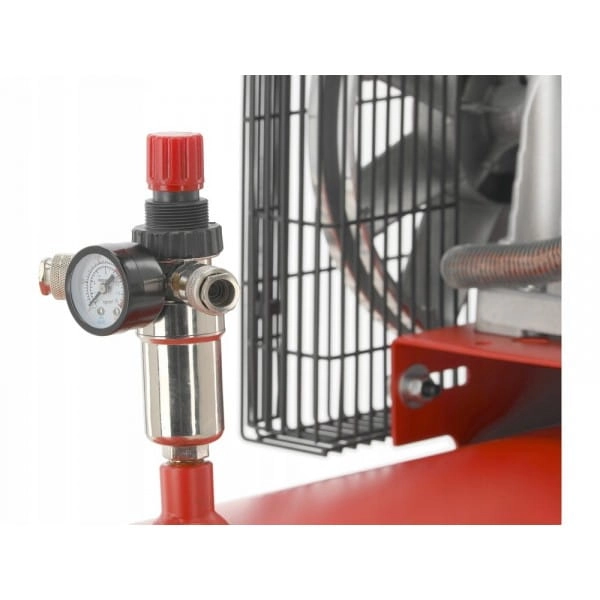 Kompresor olejowy z dwoma przyłączami i regulacją ciśnienia. Ma zastosowanie do napędzania urządzeń sprężonym powietrzem, przedmuchiwania nawiertów i czyszczenia powierzchni. Jest nieocenionym wsparciem w przemyśle, na budowie, w warsztacie i rolnictwie.