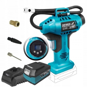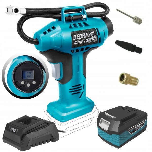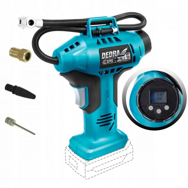 Kompresorek, pompka pistoletowa akumulatorowa 18V DEDRA SAS+ALL 11Bar, z wyświeltaczem LCD
