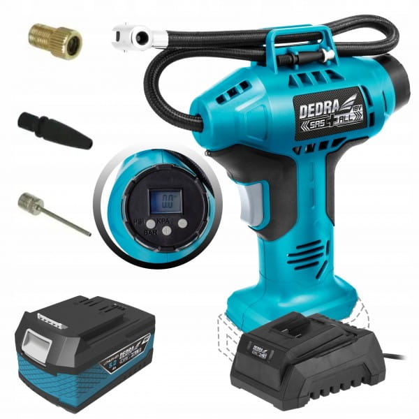 Kompresorek, pompka pistoletowa akumulatorowa 18V DEDRA SAS+ALL 11Bar, z wyświeltaczem LCD