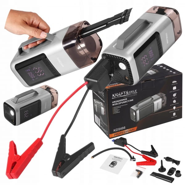 KD5498 to wszechstronne, przenośne urządzenie wielofunkcyjne marki KRAFT&DELE, które łączy w sobie funkcje pompki, jump startera, odkurzacza samochodowego, dmuchawy, powerbanku oraz latarki LED. Dzięki kompaktowej konstrukcji i dużej pojemności akumulatora 10 000 mAh urządzenie jest idealnym wsparciem w podróży, podczas awarii samochodu oraz w codziennym użytkowaniu.