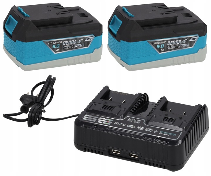 W zestawie 2 akumulatory o pojemności 5 Ah.