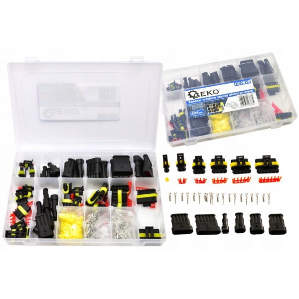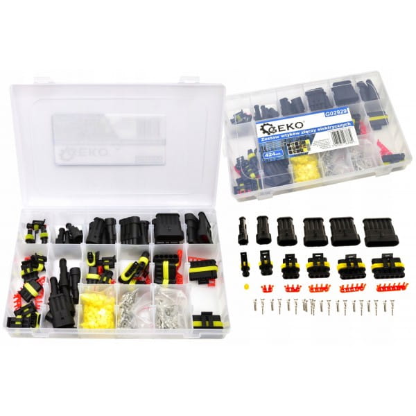 Zestaw 424 hermetycznych złączy elektrycznych w 6 rozmiarach pasujących do najbardziej popularnych średnic przewodów. Stosowane w branży motoryzacyjnej, m.in. do czujników i urządzeń w samochodach. Zapewniają bardzo dobrą izolację i szczelność.