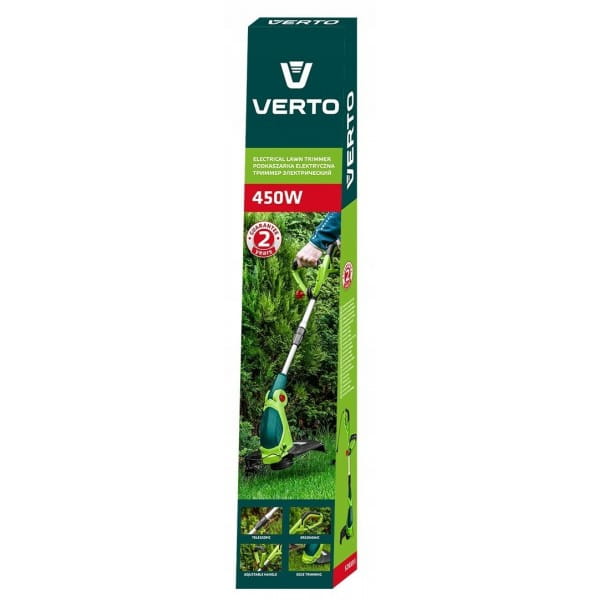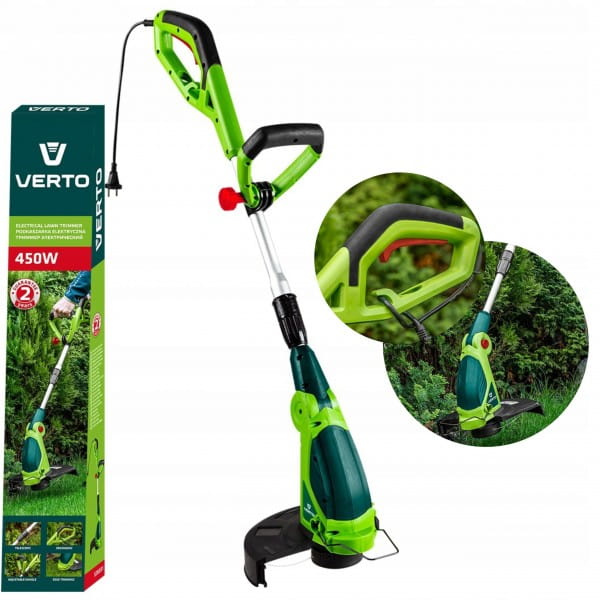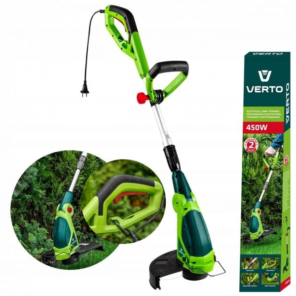 Podkaszarka 450 W, szerokość koszenia 290 mm 52G551 VERTO to sieciowe urządzenie ogrodowe, charakteryzujące się mocą znamionową 450 W. Sprawdzi się na niewielkich przestrzeniach oraz w wymagających ogrodach, gdzie tradycyjna kosiarka byłaby zbyt duża i nieporęczna. Podkaszarka oferuje szerokość koszenia 290 mm i prędkość 9 000 obrotów na minutę. Średnica żyłki tnącej wynosi 1,4 mm.