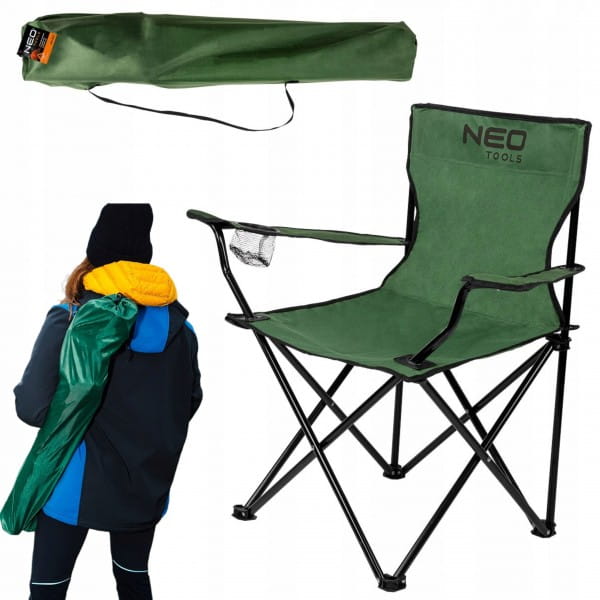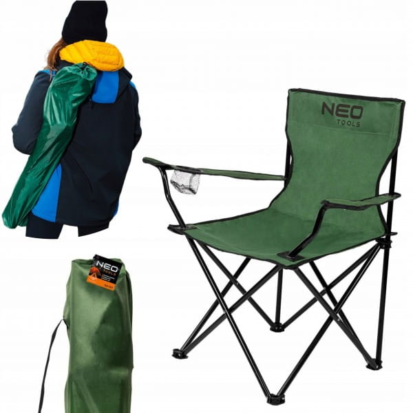 Krzesełko biwakowe, składane 63-157 marki NEO wykonane z wodoodpornego materiału Oxford 100% poliester, a także stelażu ze stalowych rurek. Maksymalne obciążenie krzesełka wynosi 120 kg przy jego wadze zaledwie 1,8 kg. Przedmiot po złożeniu charakteryzuje się wymiarami 83 x 17 x 17 cm, a po rozłożeniu: wysokość 79 cm, szerokość 79 cm, głębokość 45 cm, siedzisko 38 x 49 cm i oparcie 40 x 45 cm. Krzesełko posiada w podłokietniku kieszonkę na napój o średnicy 7 cm. Wyróżnia się możliwością szybkiego rozłożenia oraz złożenia. Oferowane jest w zestawie z nylonowym pokrowcem z uchwytem na ramię. Krzesełko marki NEO polecane jest na biwaki, wyprawy pod namiot, na ryby, pielgrzymki lub jako praktyczne wyposażenie kampera.