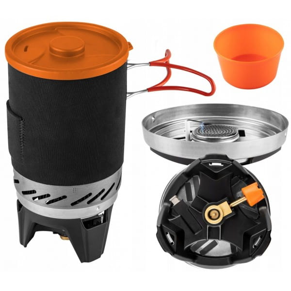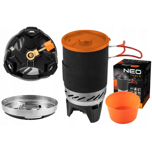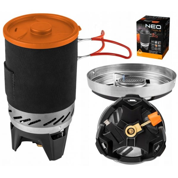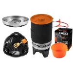 Kuchenka turystyczna garnek + palnik 63-151 marki NEO to urządzenie 3 w 1 odpowiednie do osób praktykujących survival i biwakowanie. Składa się na garnek, palnik, talerz oraz torbę transportową. Posiada zapłon piezo i umożliwia regulowanie strumienia gazu. Moc kuchenki to 2,2 kW i zużywa ona 158 g/h surowca. Dzięki radiatorowi skuteczność wzrasta o 30%. Garnek wykonano z anodyzowanego aluminium, a talerz o pojemności 400 ml z tworzywa sztucznego. Zestaw waży zaledwie 510 g. Uchwyty składane i izolowane są wygodne w transportowaniu, a pokrywa oraz neoprenowa osłona garnka pozwalają na skuteczniejsze przygotowywanie posiłków. Kuchenka kompatybilna jest z kartuszami EN 417 NEO 20-036. Posiada certyfikat dopuszczenia do kontaktu z żywnością LFGB.