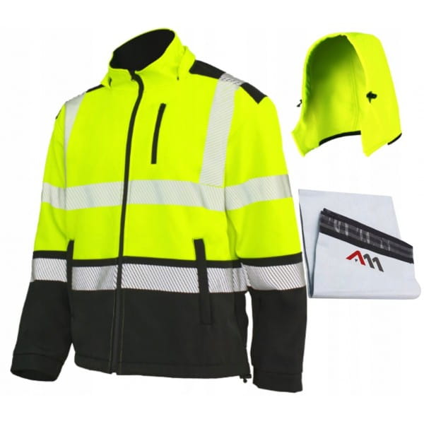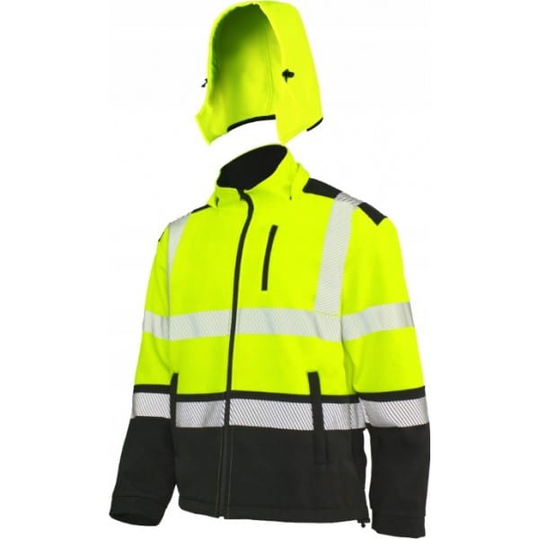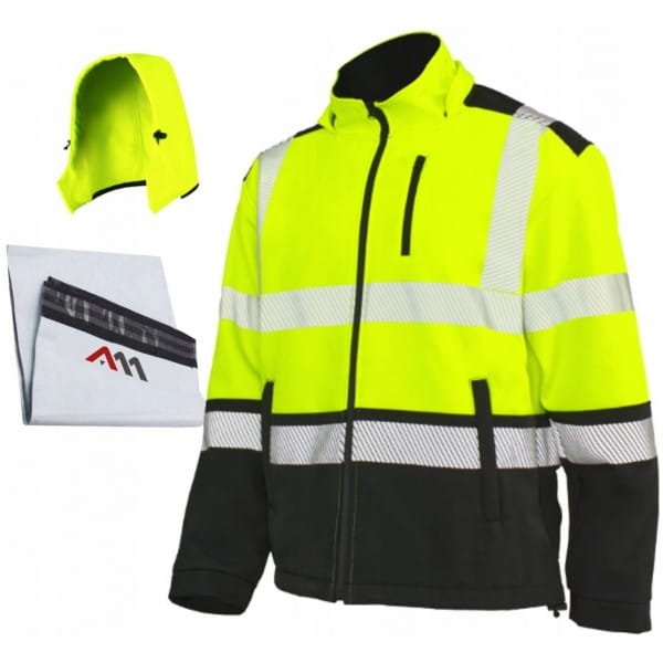 Kurtka typu softshell z segmentowymi pasami odblaskowymi. Wykonana z: 94% poliester + 6 % spandex z powłoką TPU, gramatura 320 g/m2+/- 10g/m2, zapewnia doskonałą ochronę przed wiatrem i deszczem (3000mm słupa wody).