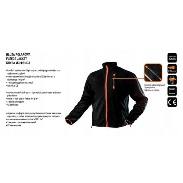 Bluza polarowa NEO. Lekki i wygodny, ciepły polar o gramaturze 300g/m2 zapewnia maksymalny komfort użytkowania podczas pracy w niższych temperaturach. Bluza posiada 3 duże zapinane na suwak kieszenie. Gwarantem jakości jest certyfikat europejski oraz wykonanie zgodne z normą EN ISO 13688:2013. Zgodność z europejskimi standardami bezpieczeństwa zapewnia certyfikat CE. Marka NEO spełnia oczekiwania profesjonalistów