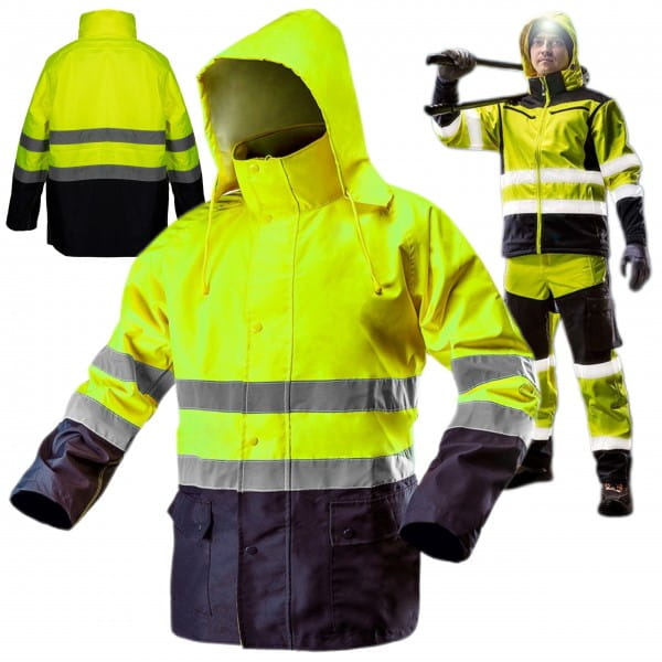 Kurtka robocza NEO o intensywnej widzialności, wykonana z wysokiej jakości, wytrzymałego materiału Oxford 300D. Kurtka o intensywnej widzialności, to praktyczne rozwiązanie zwiększające bezpieczeństwo użytkownika, polegające na sygnalizowaniu jego obecności, w każdych warunkach oświetlenia dziennego jak i w ciemności w oświetleniu światłami pojazdów. Wykonane z trwałego wodoodpornego materiału fluorescencyjnego oraz z elementów odblaskowych, zapewniających widoczność odpowiadającą klasie 2, zgodnie z wymaganiami normy PN-EN ISO 20471:2013. Klejone szwy, chowany w kołnierzu kaptur oraz materiał o wodoodporność 1000 mm pozwoli na pracę również w czasie deszczu. Gwarantem jakości jest certyfikat europejski oraz wykonanie zgodne z normą EN ISO 13688:2013