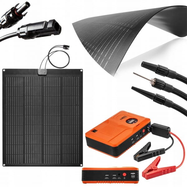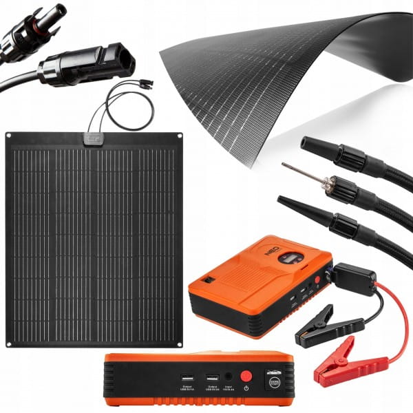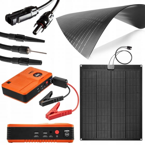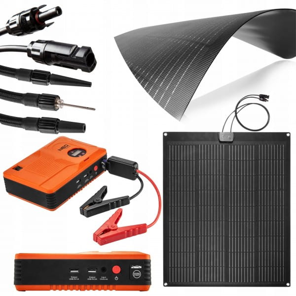 Panel słoneczny przenośny 100W, ładowarka solarna, 90-143, NEO – urządzenie sprawdzające się zarówno jako podręczna ładowarka jak i panel do montażu, pozwalający na zasilanie energią słoneczną. Wyróżnia się mocą 100W oraz półelastyczną konstrukcją, która umożliwia wygodną instalację np. do lekko zaokrąglonego dachu samochodu.
