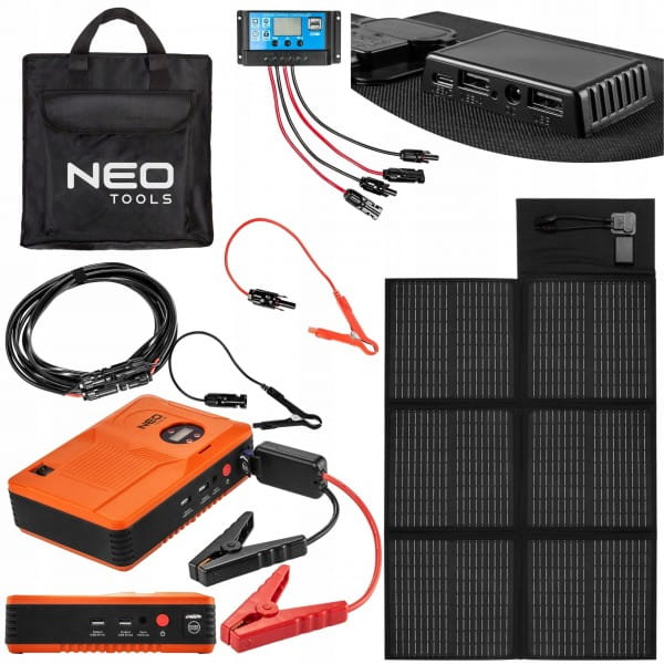 Panel słoneczny przenośny 120W 90-141 NEO oraz jednocześnie ładowarka solarna, umożliwiająca pobieranie energii słonecznej o mocy 120W. Urządzenie wyposażone jest w dwa wyjścia USB oraz dodatkowo jedno wyjście USB C. Dołączony do niego zestaw akcesoriów, umożliwia wygodne rozkładanie, transport oraz przechowywanie. Ładowarka przeznaczona jest do zasilania akumulatorów 12-voltowych, np. w łodziach czy pojazdach (samochód lub przyczepa kempingowa). Naładuje baterię telefonu, tabletu lub laptopa.