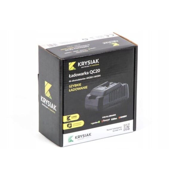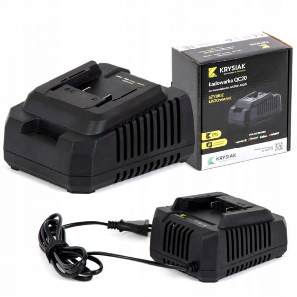Ładowarka Krysiak QC20 do wydajnych akumulatorów litowo-jonowych pasujących do wszystkich urządzeń ogrodowych z rodziny 4garden, Faworyt Pro, Lider, Handy 20V i 2×20 V