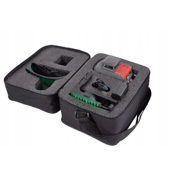 - W komplecie okulary polepszające widoczność promienia lasera, laserowa tablica celownicza (ułatwiająca wpasowanie elementów konstrukcji względem referencji wiązki laserowej), ładowarka do akumulatorów, z możliwością ładowania